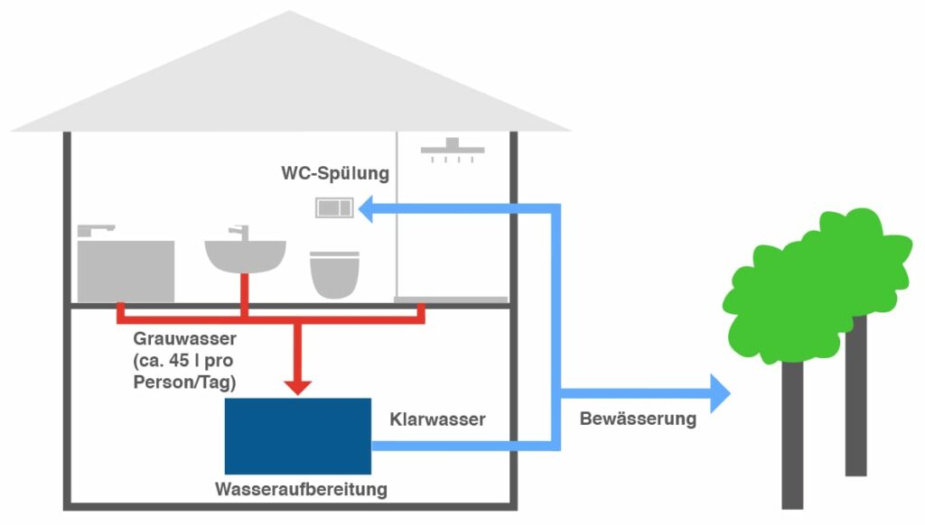Der Vorteil ist: Die Grauwassernutzung ist von der anfallenden Niederschlagsmenge unabhängig. Grauwasser fällt in einem Haushalt täglich in nahezu gleicher Menge an.